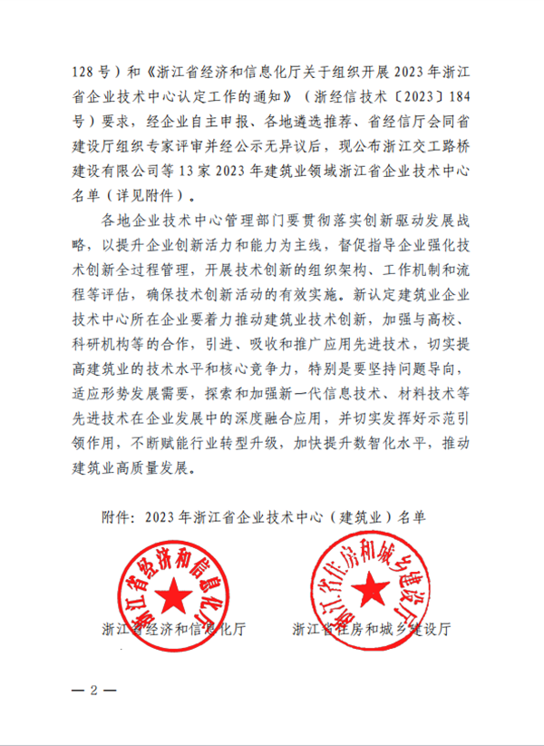 近日,浙江省經濟和信息化廳等五部門公布2023年建筑業領域浙江省企業技術中心名單的通知,我公司企業技術中心榮獲2023 年建筑業領域浙江省企業技術中心認定。
